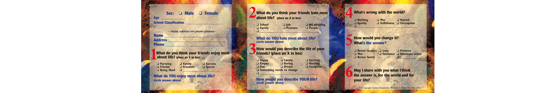 The Question is an evangelistic survey designed for use with The Answer. With its thought-provoking questions about life, the survey can provide an open door for sharing the real answer to life’s struggles.